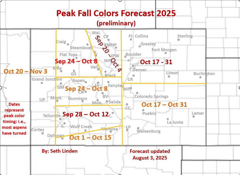 Leave it to Seth to get us thinking about golden aspen groves while we're still dealing with August heat, but his preliminary fall colors forecast is already generating excitement for Colorado's most spectacular season! Seth's calling for peak colors between September 25th and October 15th across most of the state, with some regional variations based on this year's precipitation patterns - drier areas may change colors slightly earlier while spots that received more moisture could peak on the later side of average. He's been tracking an interesting trend where Colorado's peak colors have gradually shifted about a week later over recent years, now typically hitting the end of September and early October rather than the traditional mid-September timing. Seth emphasizes that elevation beats latitude every time in Colorado, so high mountain passes will turn before lower elevations whether they're north or south.